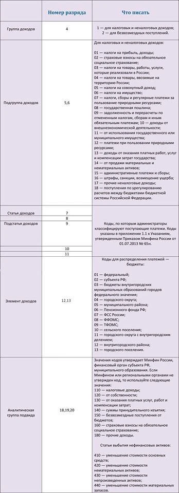 Прежде всего, КБК – особенный код, записываемый цифрами, точнее, двадцатью. Он подразумевает под собой доходы и расходы бюджета при формировании платежного поручения. Цифры кода (или по-другому – разряды) группируются в блоки. Каждый из них заключает в себе особенный смысл. Расшифровку можно найти в Приказе Минфина РФ от 01.07.2013 № 65н.